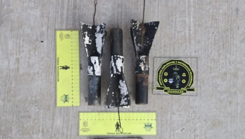 URUAPAN, MICH.- Agentes de la secretarías de Seguridad Pública (SSP) y de la Defensa Nacional (Defensa) aseguraron y desactivaron tres artefactos explosivos que habrían sido fabricados para ser arrojados desde drones, al oriente de la ciudad de Uruapan, esto en atención a un llamado de emergencia.