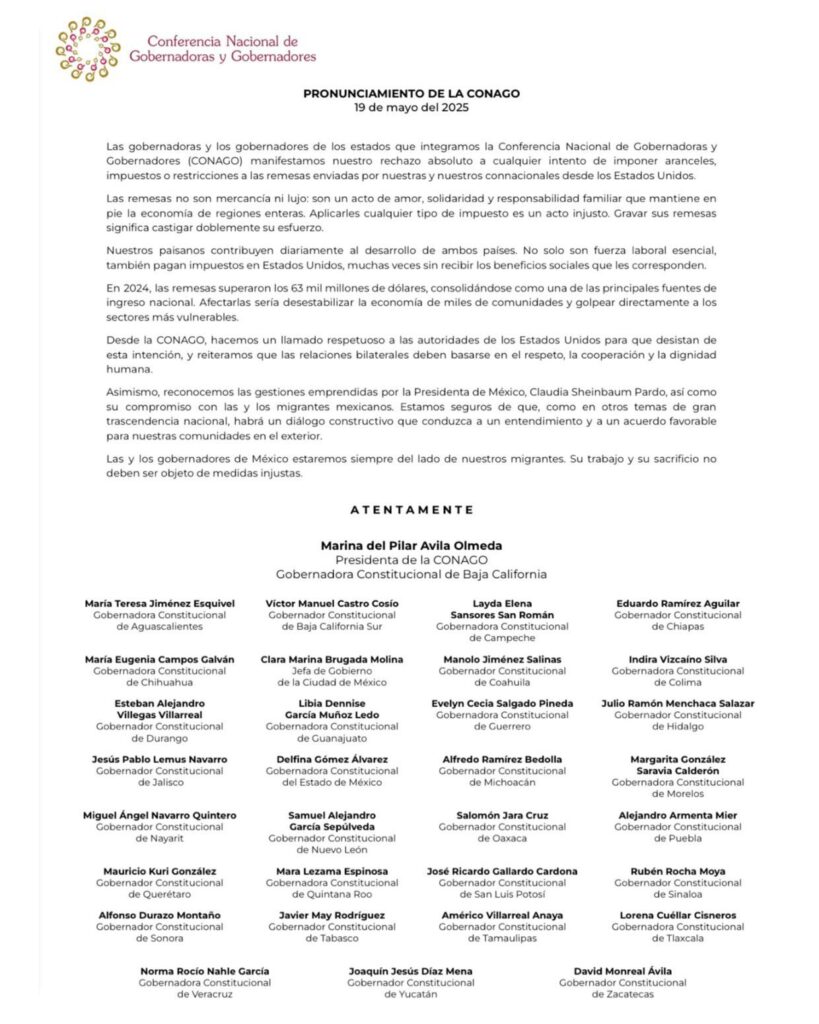 En el comunicado firmado por 31 mandatarios estatales y la jefa de Gobierno de la Ciudad de México, la CONAGO enfatizó que las remesas “no son mercancía ni lujo”, sino “un acto de amor, solidaridad y responsabilidad familiar” que sostiene economías regionales enteras.